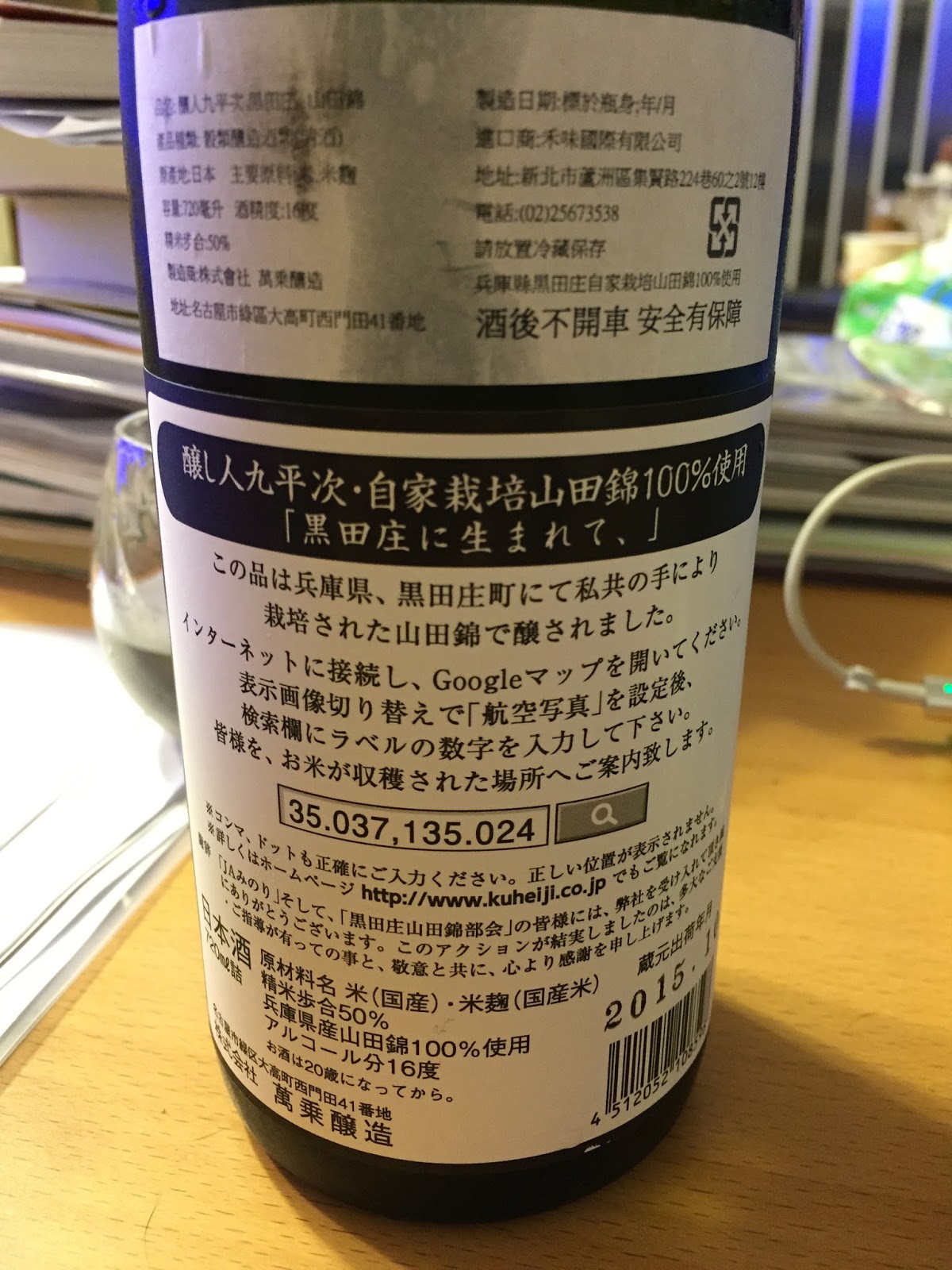 黑田庄山田錦是萬乘酒造為了保障品質的特別選地契約耕作,這家曾經打入巴黎米其林的酒造,為了把持品質下的功夫鐵定不少,瓶身上的數字 35.037, 135.024 就是酒米種植的經緯度(35°02’13.2″N 135°01’26.4″E)順手用數字查了 Google 地圖,輕敲鍵盤,大片的綠野空拍照即映入眼簾,跟這瓶酒的關係好似又更親近些。