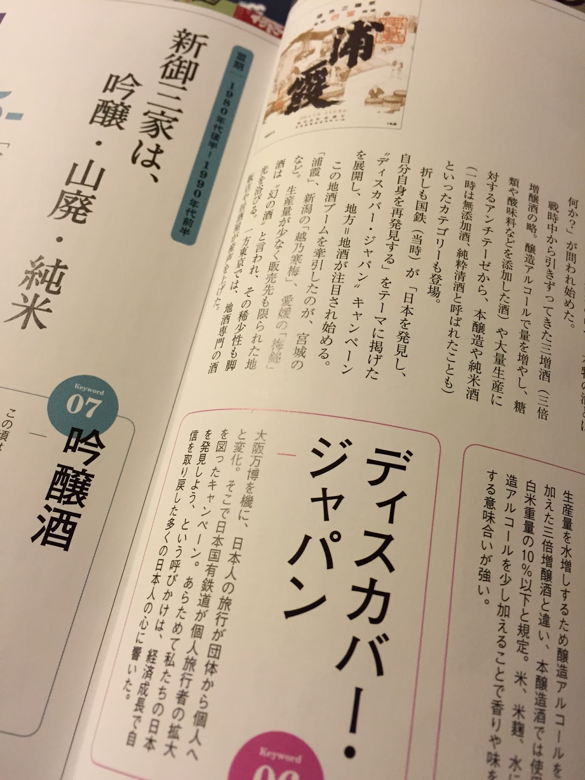 70〜80 年代經濟成長趨緩,在這期間除了確認「本釀造」制度(添加酒精重量不得超過米重的10%),對於「地酒」的興起也有一段滿有趣的推論, 根據文中所述,70年代因為舉辦大阪萬博使鐵路交通旅行活躍起來,再加上國鐵支持製作了一部旅遊節目「 DISCOVER JAPAN」* (ディスカバー・ジャパン) 帶起了個人旅遊風潮並使女性旅遊者增加,因此連帶使得地方上的「地酒」受到注目,使東京開始有專設販賣地酒的店家,其實在下也是第一次看見這個說法,覺得格外有趣。
