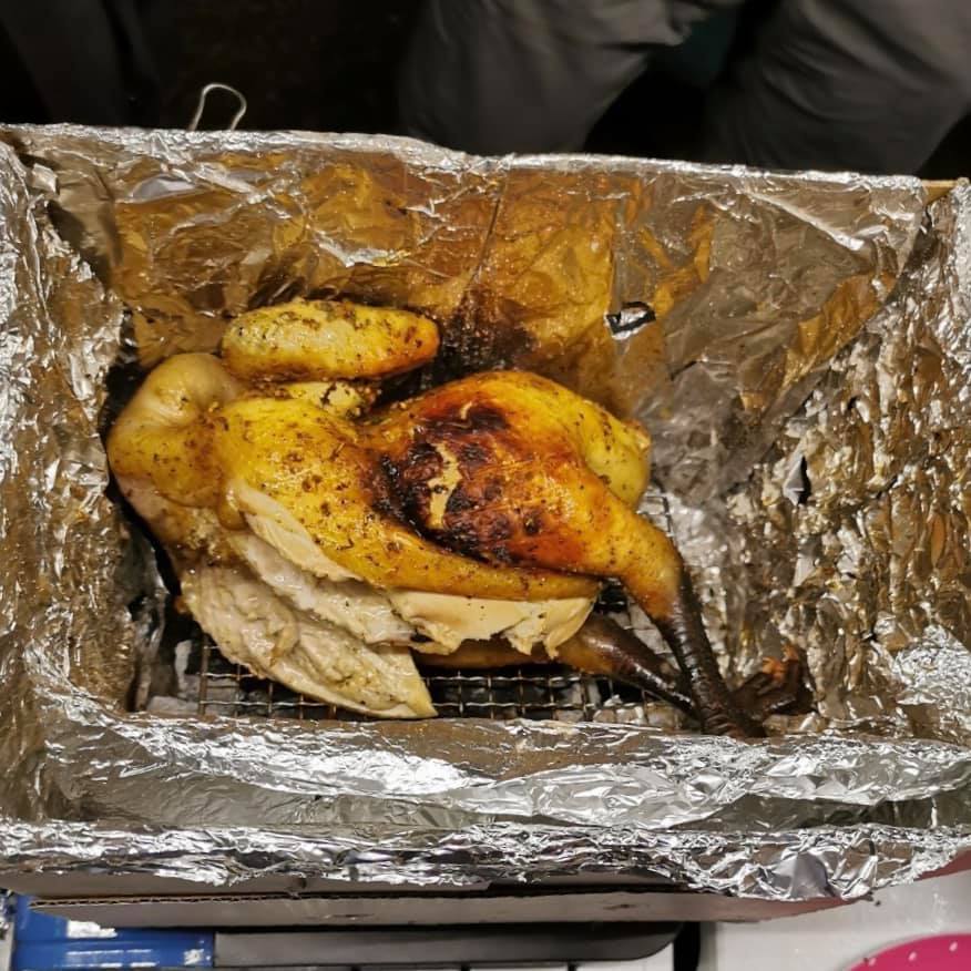 雖然沒有優雅細緻的手工杯,只有耐用不鏽鋼杯,酒體的香氣與質感是無法完整展現了;雖然也沒有澎湃豪華的下酒菜,改為友人剽悍自製悶烤3小時的A4紙箱烤雞。