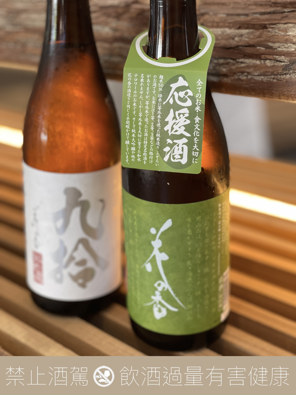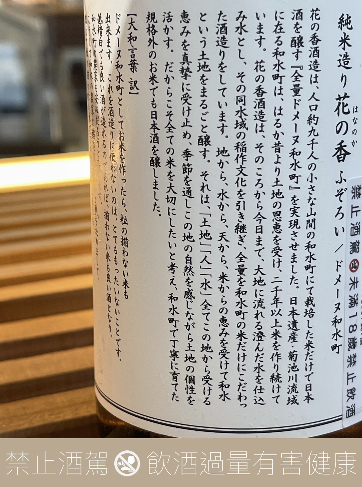 應援酒是一款代表支持在地農業的作品,全量使用花之香所在「和水町」所栽培的稻米,和水町位於熊本縣大阿蘇山的菊池川流域上,不僅土壤接收火山岩層的養分,這片流域也是日本水稻文化遺產地,應援酒使用了精米步合50%的麴米,掛米使用則全量使用等外米,既然追求真地酒,酵母當然也是熊本9號酵母。