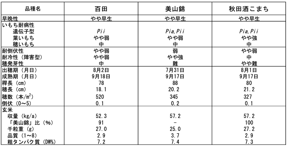 百田是平成末年所發表的秋田縣新酒米,由秋田縣農業試験場高橋竜一與川本朋彦團隊所培育而成 。
