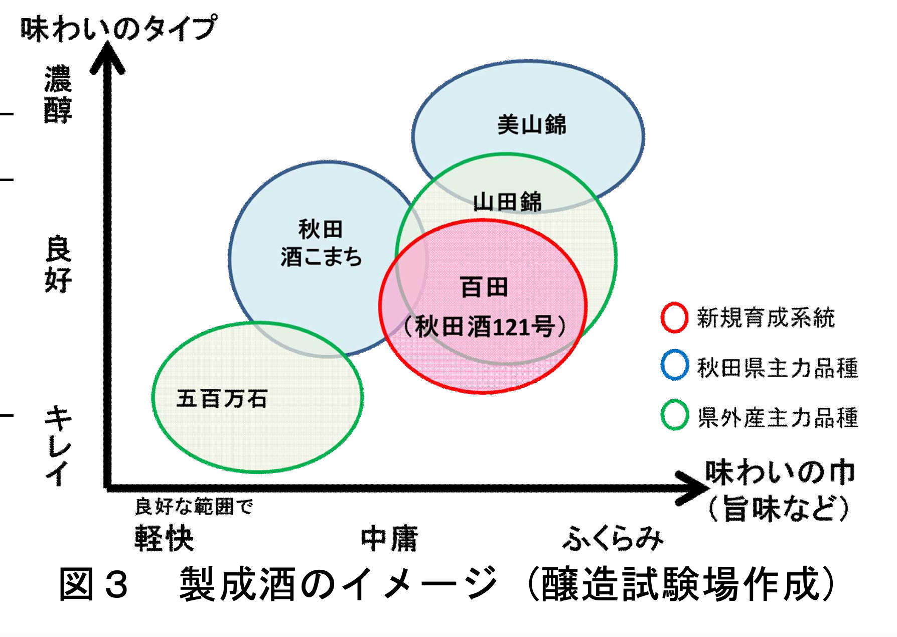 5、在實驗釀造比較方面(下圖),百田的風味特徵並非如同美山錦那般的濃醇紮實,也不是五百萬石的極度輕快乾淨,而是略帶著輕柔旨味的風格。