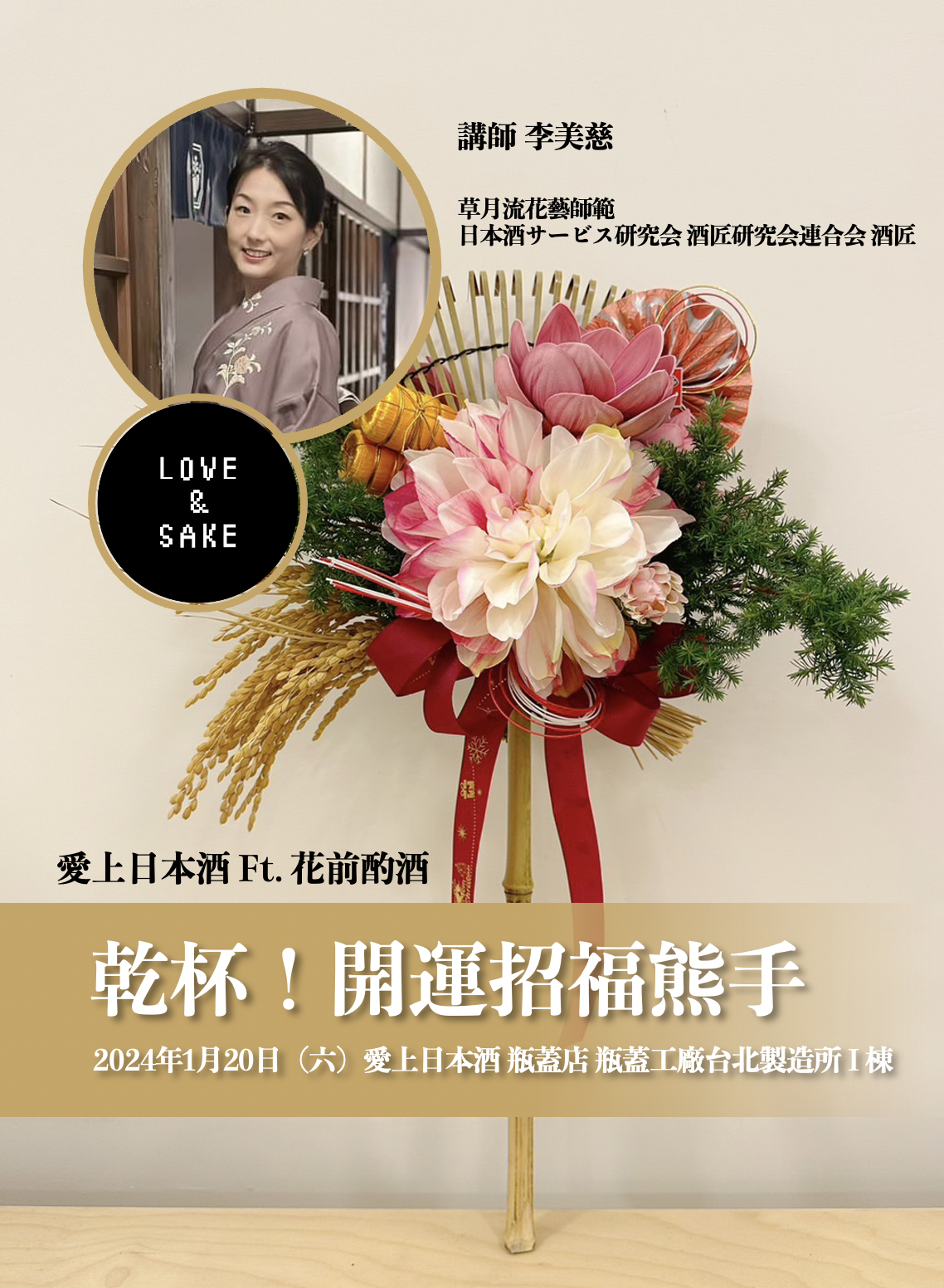 1月20日(六)午後,來瓶蓋工廠品飲龍年干支,並製作開運招福熊手吧!2024開春首場活動,敝社邀請到花前酌酒的主理人李美慈老師教學製作豪華美麗的「開運招福熊手」。