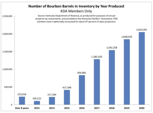 每年製造的波本桶庫存數量。圖片來源:飛行釀酒師熊爸FB