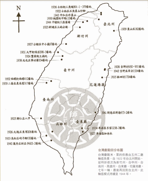 台灣的獻穀田分佈圖,天皇米之說的生成與再現,邱創裕, 41 頁;圖片來源:吉野一號 范雅鈞著
