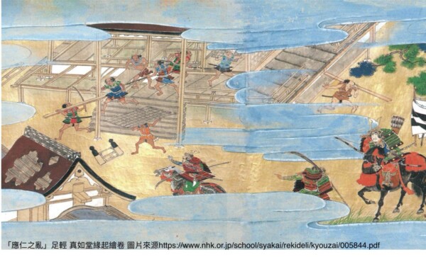 #「應仁之亂」開始於1467年,這場拖延11年的戰爭由兩位大名的官場爭權演變成東軍、西軍兩個陣營的國土爭奪,最後開啟了戰國時代。雖然打了11年,但京都的主戰場只在將軍寓所附近。對京都最大的破壞不是來自戰火,而是跟隨東西軍而來的「足輕」雜兵,這些胡亂徵召來的烏合之眾被京都人形容為「白日搶匪」,令京都的中下層官吏、商人、工匠苦不堪言。