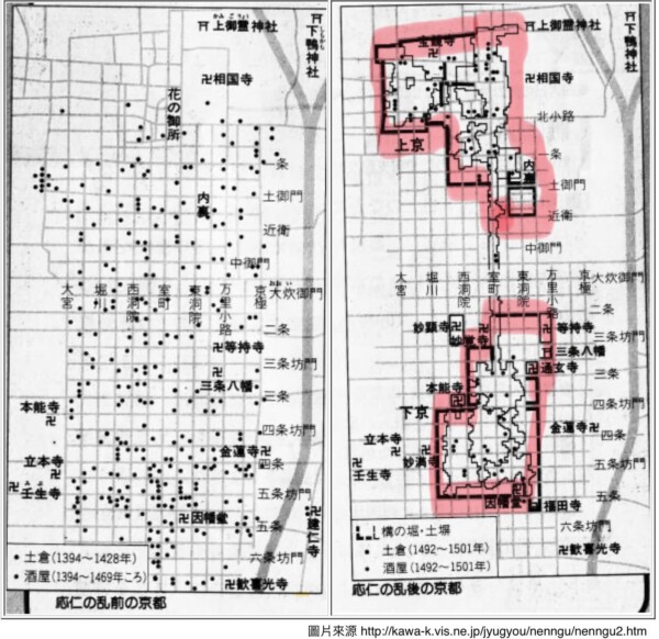 從附圖裡可以看到,「應仁之亂」之後,專門用來儲藏貴重物品的酒屋土倉不但大量減少,而且被逼退到東軍西軍築構的壕溝圍牆保護區內。