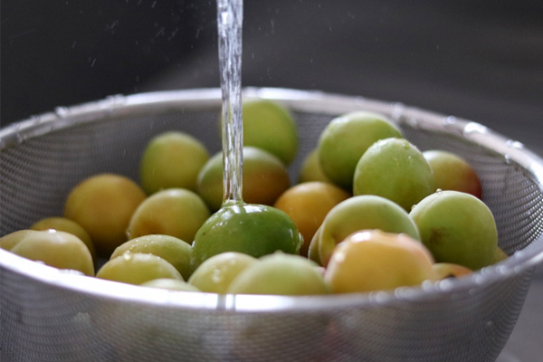 首先用牙籤去除梅子的蒂頭後,以清水將梅子洗淨、並晾乾(可以將梅子平鋪風乾,或使用電扇吹乾)。這步驟要注意梅子一定要呈現乾燥狀態才能置入容器中,否則可能會有發霉的風險。