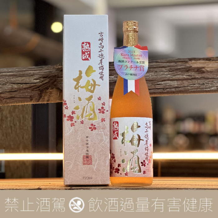以宮崎縣高千穗夕影之町所產的優質梅子,並使用「本格麥燒酎」所釀製後熟成,高濃度的原酒萃取出各種精華,將梅子的香氣表現得十分柔和。飲用時,醇厚酸甜滋味在口中漫延而開,濃厚的梅子味充滿口腔。