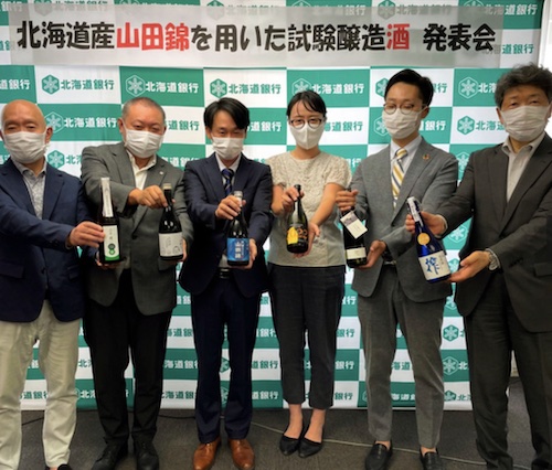 圖片來源:朝日新聞,北海道産の山田錦を使った新酒を手にする酒造6社の代表や杜氏(とうじ)ら=2022年7月28日、札幌市中央区の北海道銀行本店