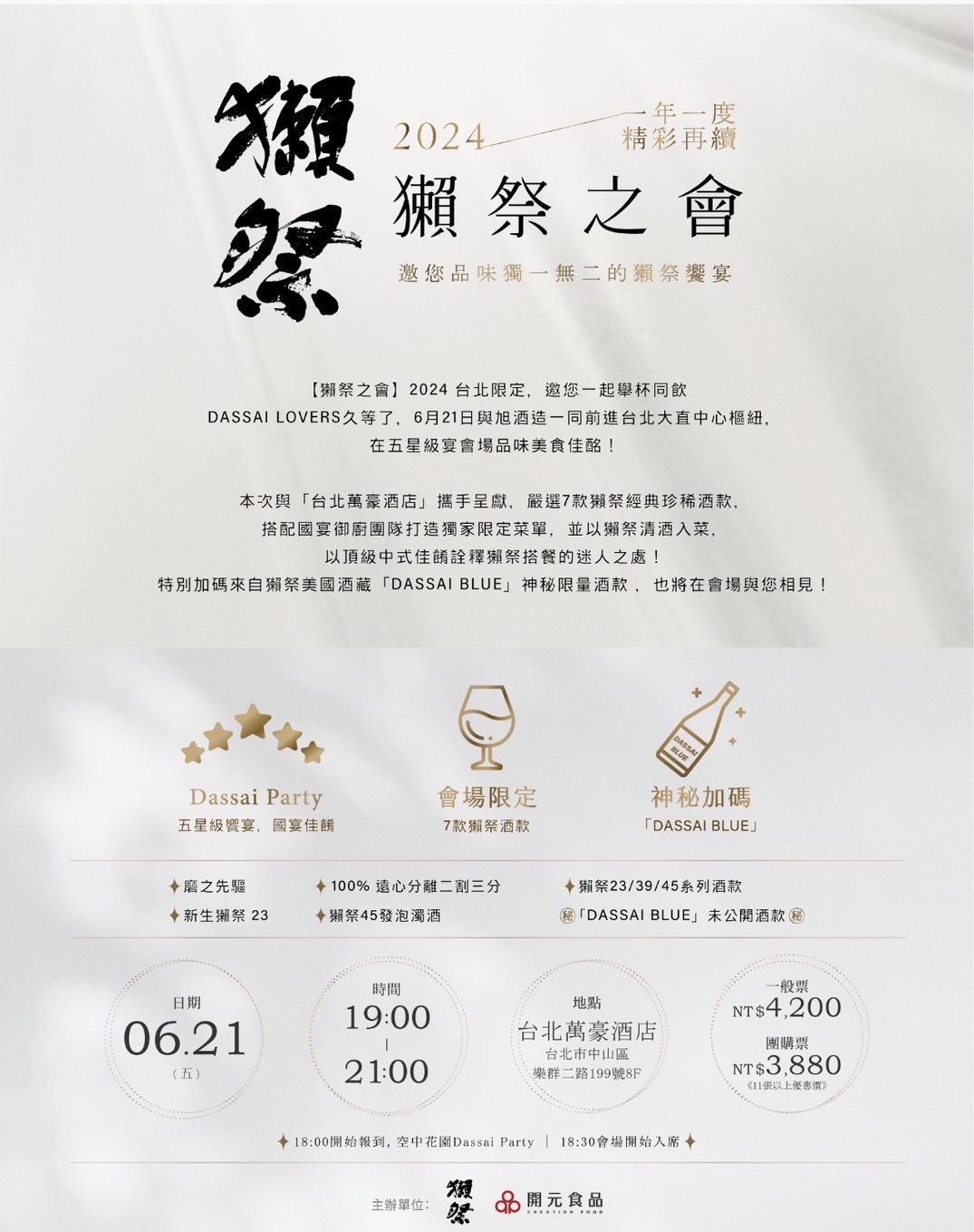 獺祭 BLUE 下個月也準備來到台灣囉!BLUE 將在開元食品舉辦的「獺祭之會」首次於台灣亮相,這次的餐會是與台北萬豪酒店合作,精選七品獺祭作品搭配國宴御廚團隊打造的菜單,同時會以獺祭清酒入菜。
