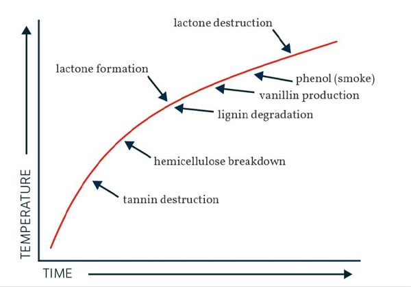 首先我們需要了解的是,讓酒存放在經過烘烤的木桶中所產生的風味,與直接存放在新鮮木材中的風味差異極大。烘烤過程中高溫對木材纖維進行分解,從而產生各種不同的有機化合物,包括香氣和單寧等。