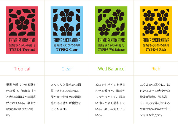 「愛媛櫻姬酵母」有四種,分別是產生熱帶水果華麗香氣的Type1,柔順清涼的Type2,香氣與口感相當平衡的Type3,以及香氣與口感濃郁奔放的Type4。