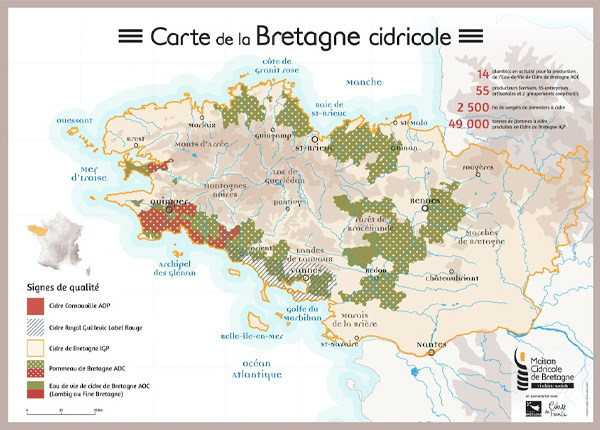 但我們不能否認的是,Cider的歷史悠久,當然在法國常聽到的是兩大產區布列塔尼(Bretagne)和諾曼第(Normandie),其中的科努瓦耶AOP蘋果酒(cidre de Cornouaille AOP),則是唯一受原產地名稱保護(appellation d’origine protégée)的布列塔尼蘋果酒。