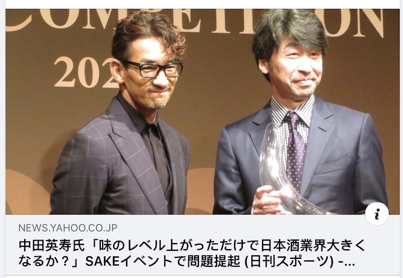日本前職業足球選手中田英壽在Sake Competition會場上表示:「難道日本酒的品質(口感)提升了,市場就會變大嗎?日本酒造需要的是品牌力。」