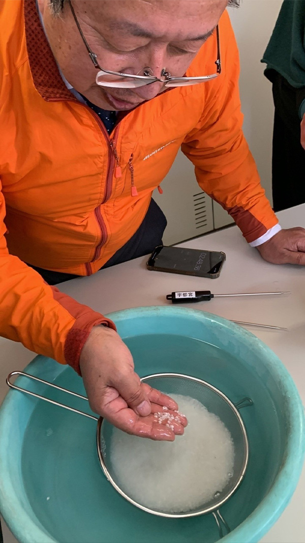 過去には多くの高橋圭博士の論文を読んでおり、今日は彼が全国新酒鑑評会審査の目的と審査方法を説明しました。私も高橋先生にNRIBの目線で4MMPという香りについて質問させて頂きました。午後のもう一つのポイントは、宇都宮先生がミニスケールで、お米を洗うから蒸すまで、そして麹を作るの過程を実際に体験させてくれました。
