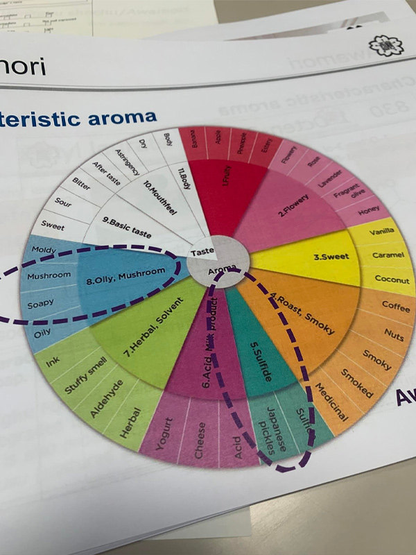 這次的研修我還發現一件蠻重要的事,在日本酒學術與行政單位,對香氣的描述是以香氣輪的標準名稱與編號(化學式)來溝通,而這些標準名稱也常見於國際上不論是用英語或日語所舉行的各式比賽。關於這點,我想經過這次研修後,我會導入在我教授的課程中,也希望同學們都能早日在品飲實務上能與日本官方所用的系統接軌。