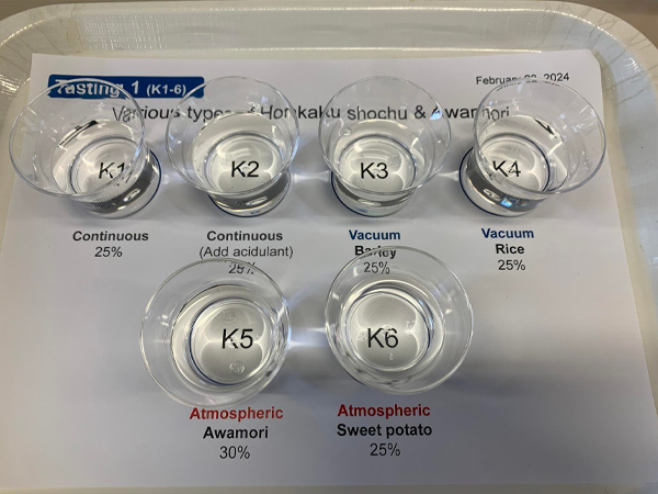 接下來則是由日本國稅廳旗下的酒類總合研究所主任研究員長船行雄博士帶領我們進行米燒酎、麥燒酎與泡盛的第一階段品飲練習。當然我也抓住這個機會詢問了「泡盛中焦糖香氣的生成原因」、「泡盛新酒兌古酒的理由」、以及「燒酎Off-Flavor的型態與變化」等科學實證下的答案。