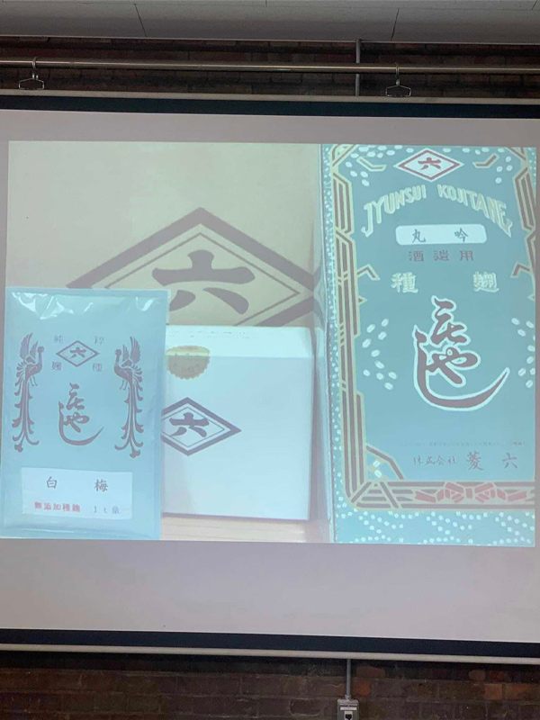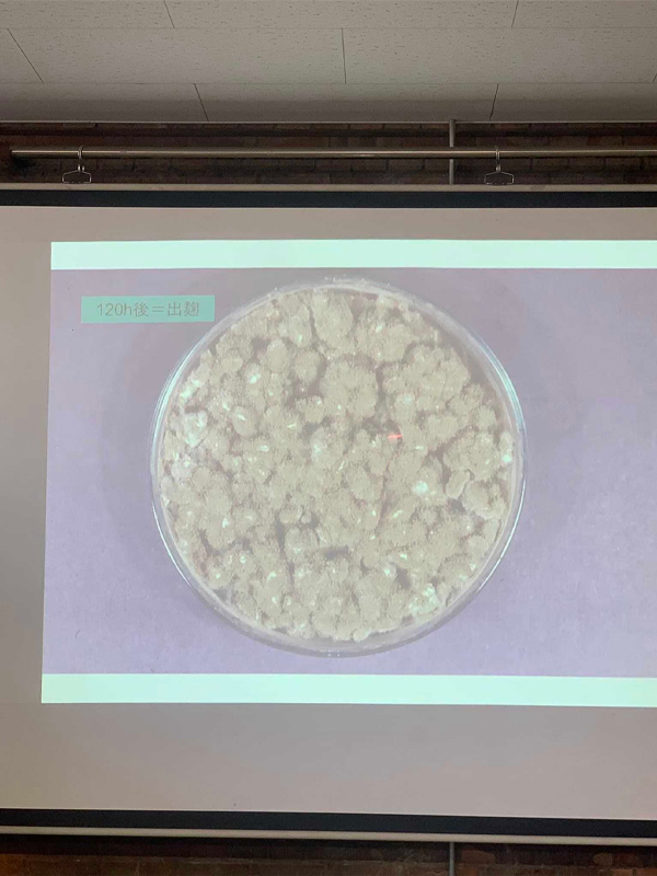 「酵母」の講義に続いて、京都からお越し頂くもやし屋である「菱六」助野章彦社長が「麹菌」について講義しました。社長は、麹の形状や胞子の外観、破精込みなど、麹屋の観点から私たちに新たな視点を教えてくれました。これまでのトレーニングは程んと酒造りの立場で学んできたことですが、今回の講義で麹屋の視点からも理解できました。私も「吟醸用麹」の求め要件についても質問させて頂きました。