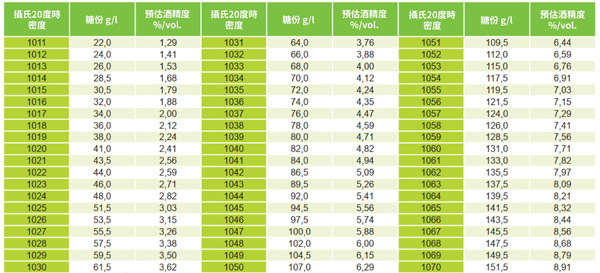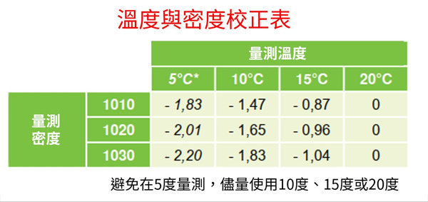 要注意的是,比重與糖分含量對應表是基於特定溫度計算的,所以當我們計算糖度的時候,千萬要記得控制好量測的溫度,來進行適當的校正,免得失之毫釐差之千里。當然若要討論到法律效力,只有通過實驗室糖分定量測定並以克/升(g/l)表示的糖分含量才具備,密度測量法也只是僅供參考。