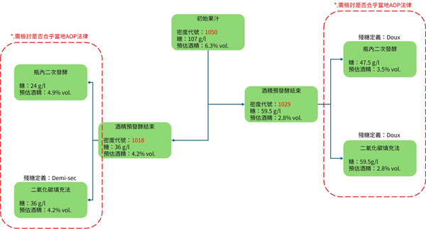- 氣泡發酵過程,包含瓶內二次發酵,都會消耗糖分,從而增加酒精度,這可能對最終產品的分類產生影響。