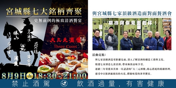 更不僅是DATE SEVEN,八月九日(五)這七位藏元「浦霞 株式會社佐浦」、「勝山酒造」、 「墨迺江酒造」、 「伯樂星 新澤醸造店」、「黃金澤 川敬商店」、「山和酒造店」、「萩之鶴 萩野酒造」 將親自共同來台,並帶著他們的代表銘柄與大三元攜手合作,舉辦粉絲見面會。