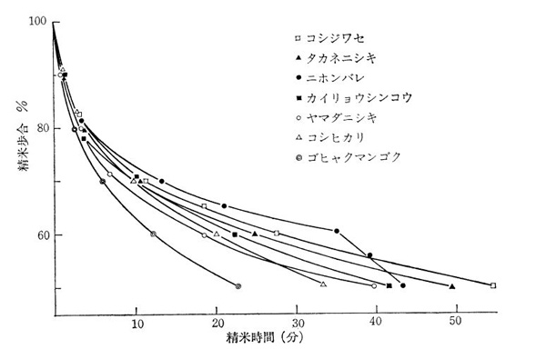 不同米種的精米時間,可以看到在最外層(90%)所需要的時間接近,但是越高的精米越因為米的組成與性質不同,精米時間有很大的差異。圖片來源:日本酒初心者的不專業筆記