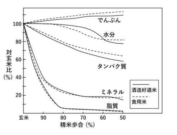 隨著精米步合的降低(即米粒被磨去更多外層),像蛋白質這類成分會逐漸減少,從而改變酒的風味。