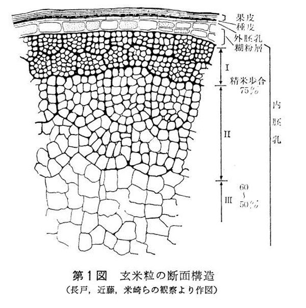 根據研究者米崎等人的觀察,米粒的澱粉細胞可以根據細胞大小和包覆澱粉的蛋白質膜厚度分為三層。