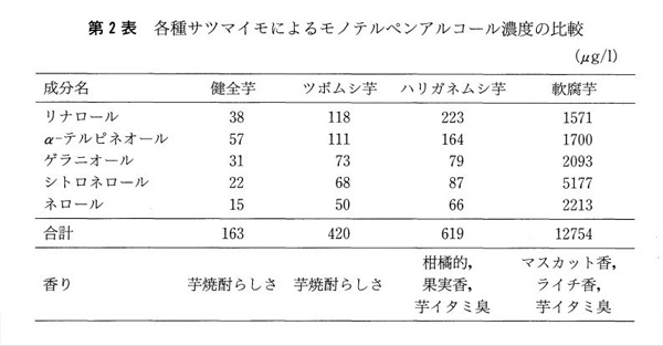 這些單萜醇類化合物在米燒酎和麥燒酎中並不存在,因此成為芋燒酎獨特香氣的來源。