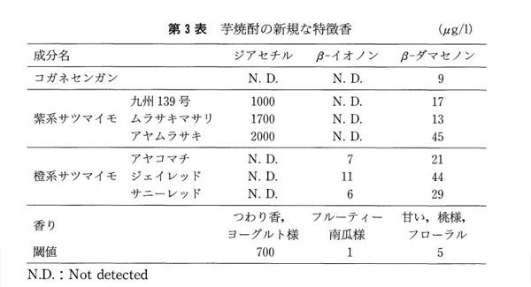除了品種的影響外,研究還揭顯示了芋燒酎中的一些新確認的特徵香氣成分,包括β-達瑪烯酮、安息香酸甲酯、異丁香酚和玫瑰氧化物。
