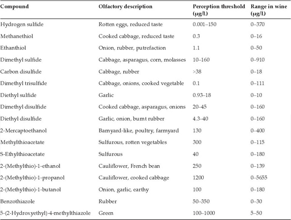 硫化物,特別是揮發性硫化物 (Volatile Sulfur Compounds, VSCs),是發酵、陳年,甚至是酒精發酵過程中的副產物。它們的氣味可以從微妙的「堆肥味」到強烈的「臭雞蛋味」,在酒品中會有不同程度的表現,常見的硫化物包括: