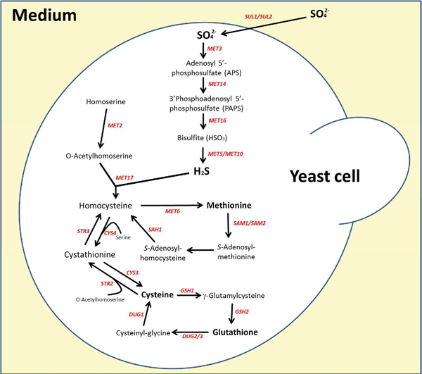 酵母菌從外部環境吸收硫酸鹽(SO₄²⁻),並經由一系列的酶反應將其還原為氫硫化物(H₂S)。這一過程中,MET基因(如MET3、MET14、MET16等)調控了酵母將硫酸鹽轉化為亞硫酸鹽(SO₃²⁻)及硫酸根(HSO₃⁻),最終生成H₂S。