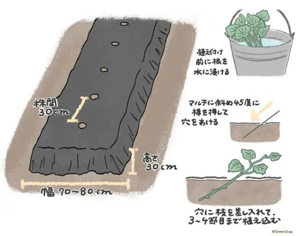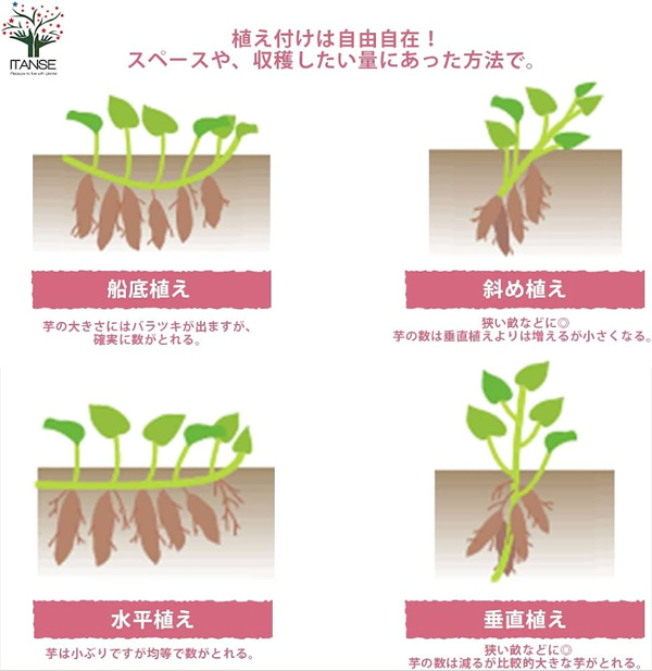 斜面插苗指將地瓜苗以一定角度插入土壤,使根部既能向下生長,也能向側面發展。這種方法在像小林市這樣的丘陵地帶同樣也可以進行,利用土壤的淺層和深層養分。