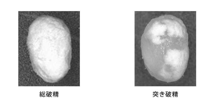 「總破精」是表面布滿菌絲分佈型態,被認為適合作為酒母麴;「突破精」是表面成班點狀,雖看來菌絲較少,但已經菌絲深入內部的的分布形態,被認爲適合作為掛麴。圖片來源:灘酒研究會
