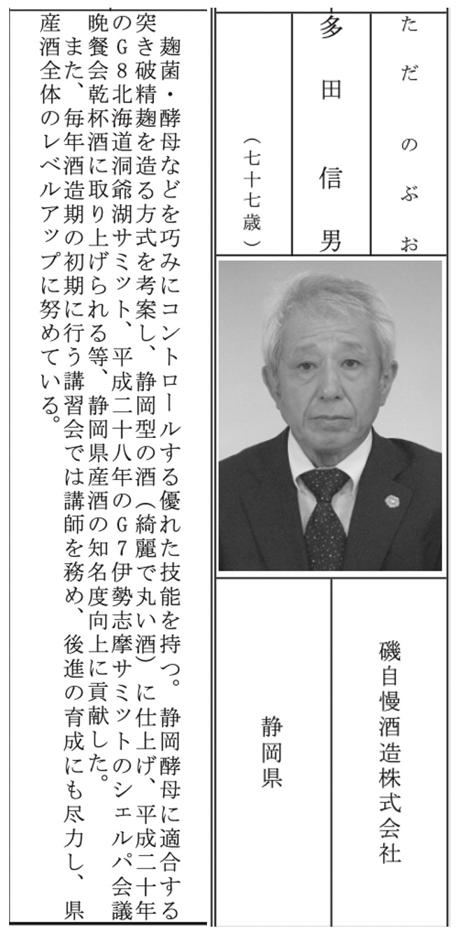 多田信男杜氏受獎時77歲,受勳內容寫著:「擅長控制酵母、麴菌等,巧妙地設計製造清酒的方法,專注於靜岡風格的清酒,致力於釀造出圓潤的清酒,並為伊勢志摩G7峰會上的清酒知名度提升作出貢獻。每年在清酒釀造期的初期擔任講師,參與講習會,致力於培養後繼者,並努力提升靜岡縣內整體的清酒水準。」