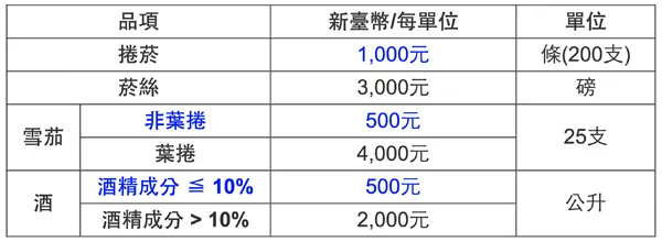 - 啤酒:每公升徵收新臺幣 26 元。