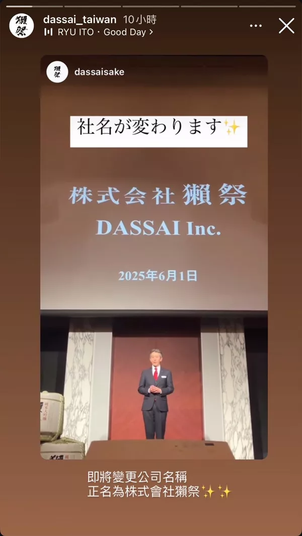 公司名稱即將更名為「株式會社獺祭」。圖片來源:截自獺祭 dassai_taiwan