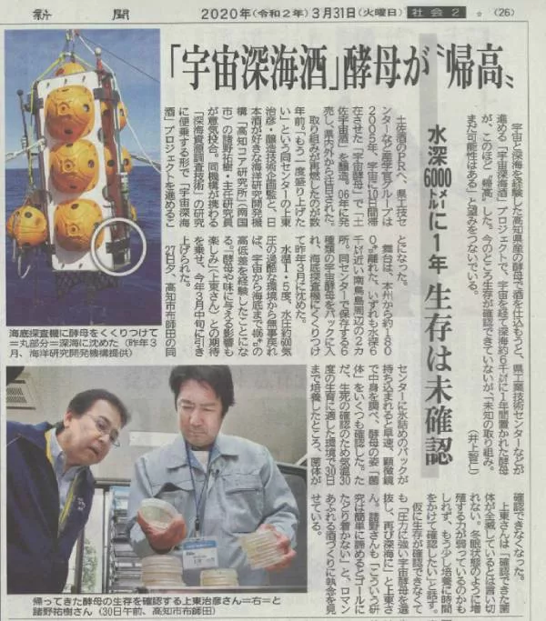 2019 年 3 月 4 日,研究團隊將酵母裝載於海底探測裝置「江戶っ子 1號」,將其沉入南鳥島周邊海域的深海,這片水域距離本州 1800 公里,是日本最東端的海域,北側水深 5540 公尺,南側更達 5770 公尺,水溫低至 0~1℃,計劃讓酵母在這樣的極端環境下浸泡整整一年。這是世界上首次嘗試讓宇宙酵母挑戰深海,能否成功誕生「土佐宇宙深海酵母」,成為一場前所未有的實驗。