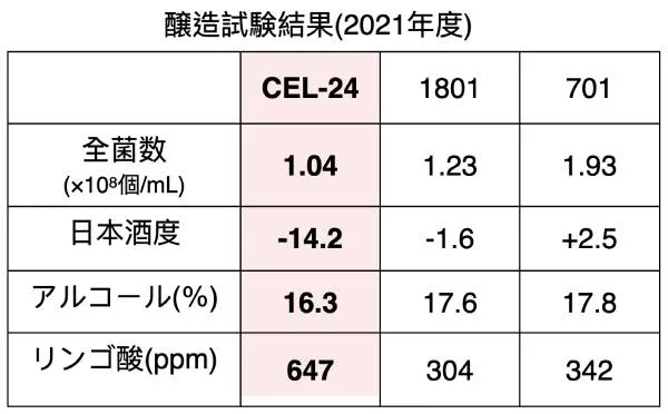 與 CEL-19 同年開發的 CEL-24,則進一步提升了己酸乙酯與蘋果酸的生成量,幾乎是 CEL-19 的兩倍之多。這款酵母以濃郁的香氣著稱,是日本國內數一數二香氣濃郁的酵母,所釀清酒帶有酸甜鳳梨或蘋果汁般的風味。