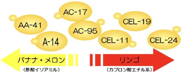高知酵母以果香為特色,往左帶有香蕉・哈密瓜(乙酸異戊酯)香氣,往右帶有蘋果(己酸乙酯系)香氣。圖片來源:CEL24酵母の開発者に聞く土佐酒の魅力——上東治彦