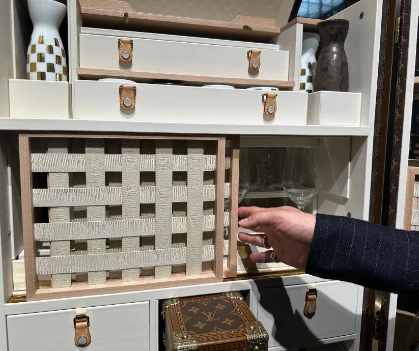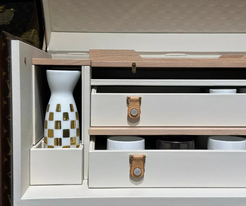 以 Damier 棋盤格紋發想設計的日本傳統酒壺「德利」(Dokuri),上層抽屜有較小的「豬口杯」(Ochoko),下層則擺放較大的「吞杯」(Guinomi),豬口杯大約是成人一口能喝完的量,吞杯稍大一些些,大約是三、四口。