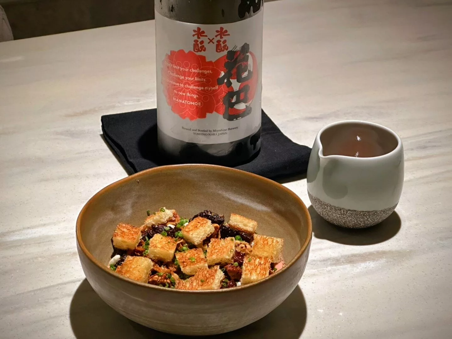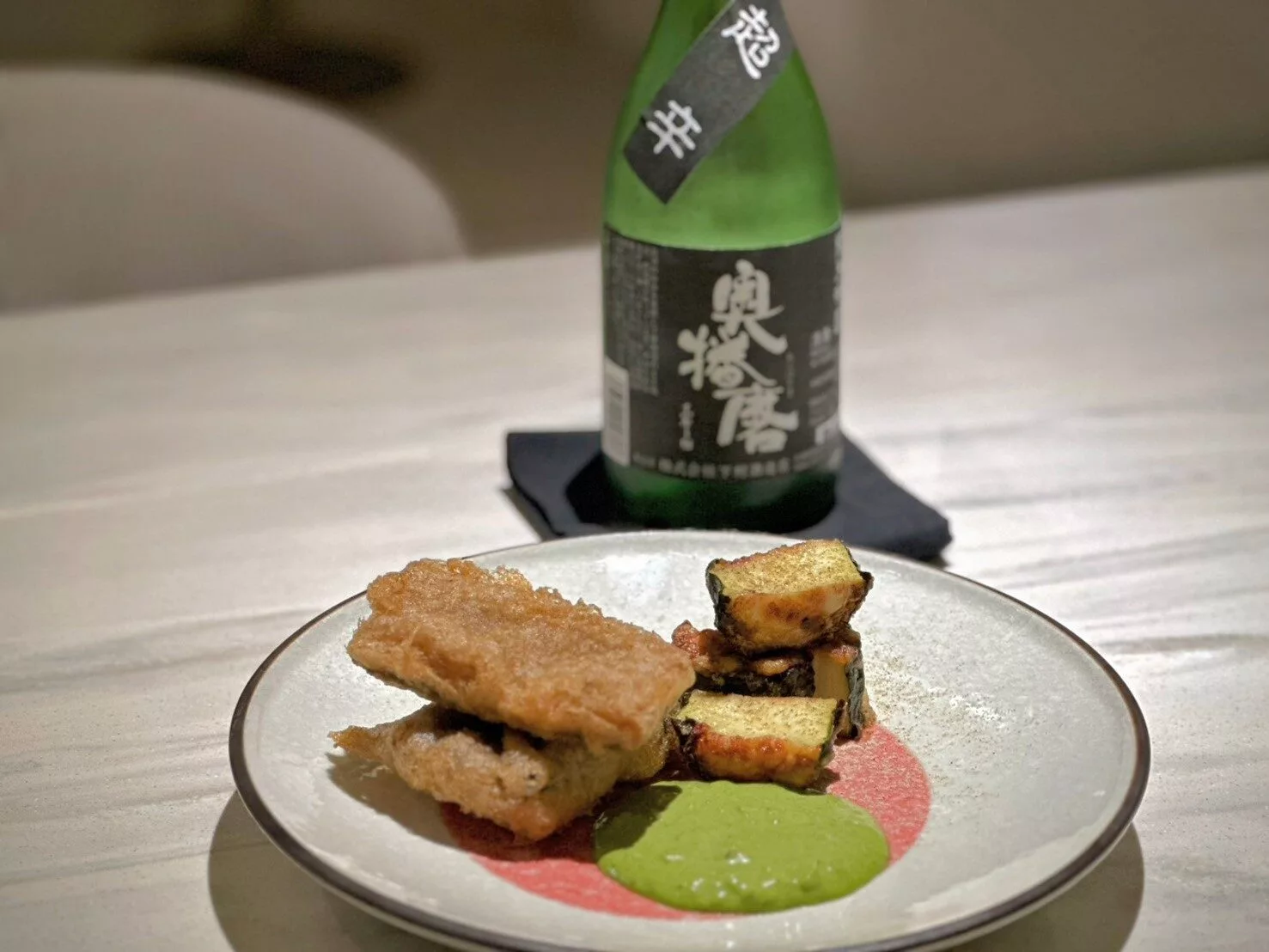 雲林白鰻酥炸至外酥內嫩,麵衣加入花椒與青花椒香氣迷人,搭配酸香綜合魚露醬更添風味。兵庫縣「奧播磨 芳醇超辛 純米吟釀 黑」以濃厚旨味與清爽酸度中和炸物油感,帶來豪邁爽快的口感體驗。