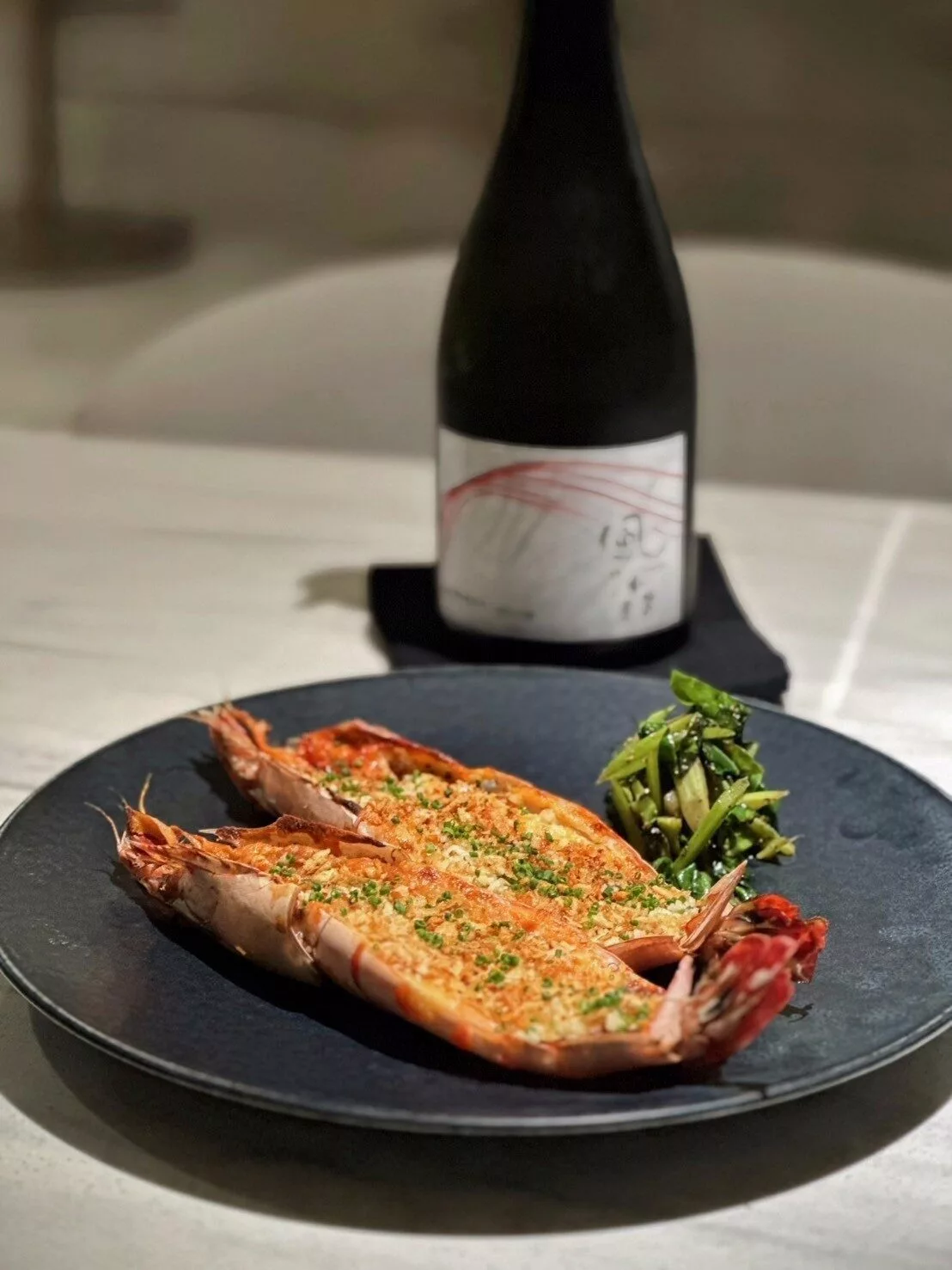 焗烤虎蝦結合鹹蛋黃起司醬與避風塘蒜酥、豆豉芥藍,重口味層次豐富。選用「風之森 Alpha 1」帶有柑橘系酸度與氣泡感的輕盈酒體,不僅不被搶味,反而更襯托料理豐富張力。