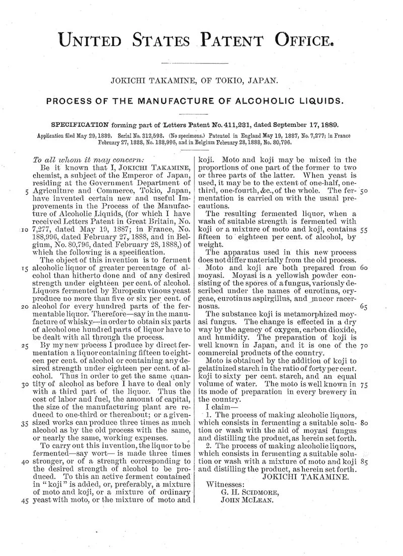 接著在 1894年,高峰讓吉為這項發明申請並取得了美國專利(US525,823),成為他在美國的第一個正式專利。而這項酵素,也正式以他的名字命名為「Taka-Diastase」(高峰澱粉酶),這不僅是產品的商標名稱,更象徵著一位來自日本的科學家,以自己的方式在西方留下了名字。