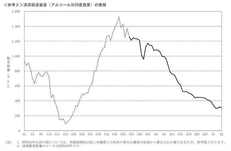 圖片來源:清酒の製造状 況等について令和5酒造年度分,清酒製造量在昭和22年(約1947年)的戰後時期為低點,之後迅速上升。在昭和48年(1973年)達到歷史最高點,製造量超過1,400千kL。自1973年後,清酒製造量開始長期下滑。到令和5年(2023年)時,製造量下降至約300千kL左右,僅為高峰時期的不到1/4。昭和52年(1977年)之前的數值是依據與現行調查方法不同的推估資料所算出。