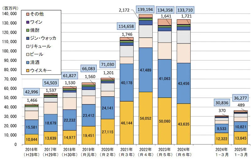 圖片來源:酒類の輸出動向。2016–2020 每年都有顯著成長,2020年達 27,115 百萬日圓。即便 COVID-19 疫情發生,出口仍逆勢上升。2021年出口金額暴增至 40,178 百萬日圓。2022年更達歷史高峰 47,489 百萬日圓,相當於2016年的4.5倍。2023年略為回落至 41,063 百萬日圓,仍遠高於疫情前水平。可能反映疫情紅利消退、全球貿易恢復常態。