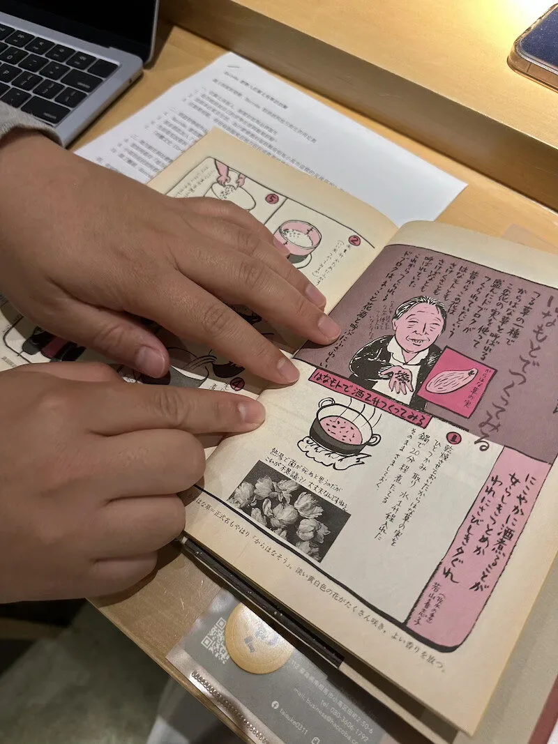 佐藤先生分享關於唐草花與濁酒的書籍紀錄,攝於吉力酒藏。