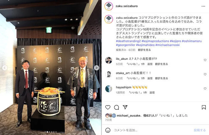 為慶祝工作室成立 10 週年,Kojima Productions 與日本醸造酒品牌「作(ZAKU)」攜手合作,以工作室象徵標誌「Ludens(遊者/遊玩者)」為主題,推出特別酒款。該合作同時透過 YouTube 公開了專屬影片,展示兩個來自截然不同領域的匠人,因酒而共鳴的姿態。