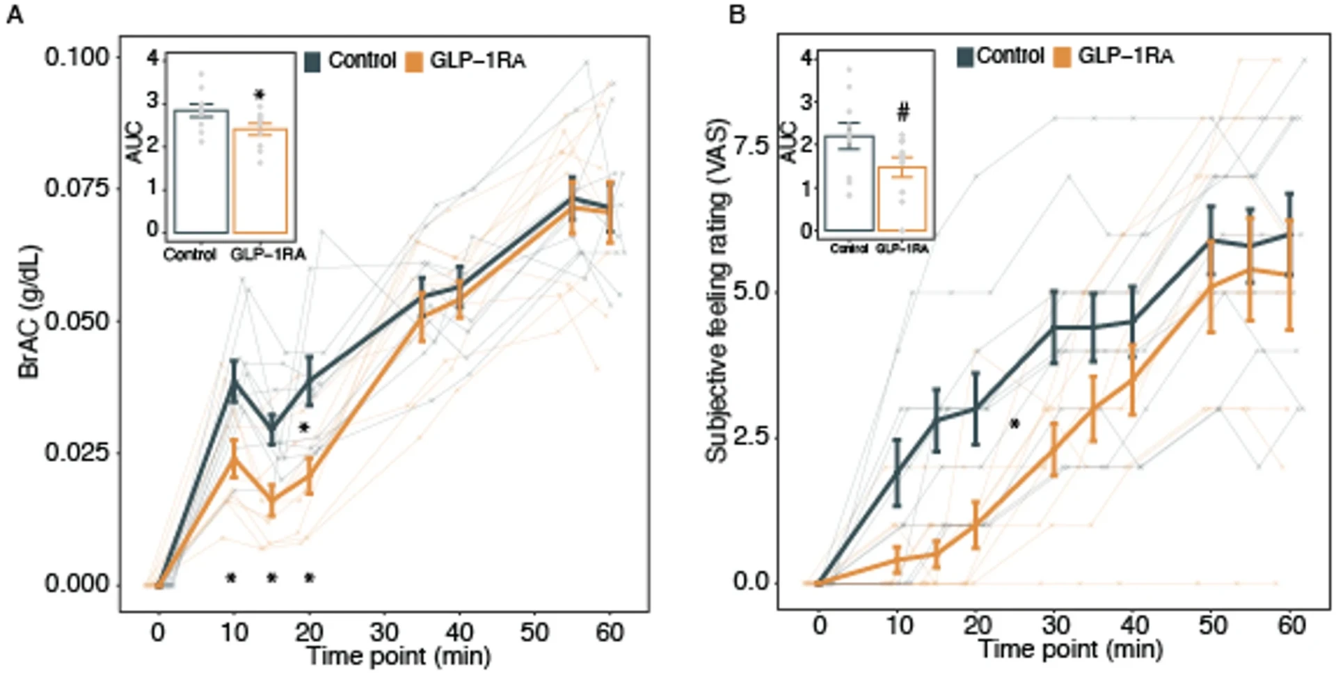 結果顯示,GLP-1RA 組在飲酒後第 10~20 分鐘時的 BrAC 明顯較低,且整體曲線下面積亦減少。